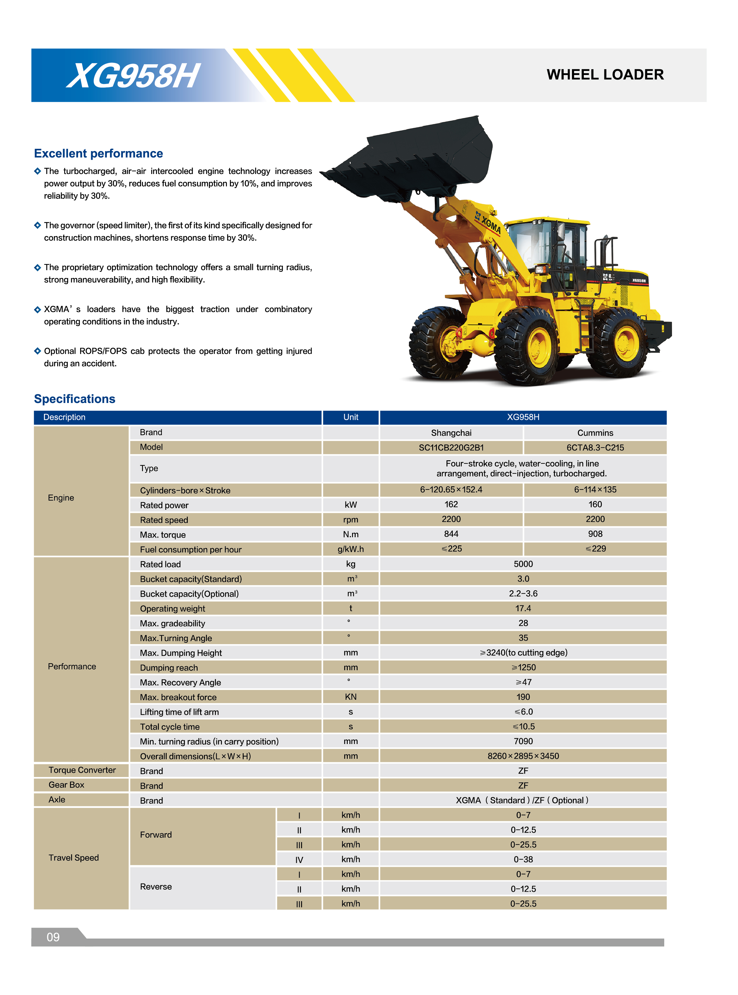 1.High Reliability Upgraded & enhanced front & back frames Optimized H-series bucket Enhanced front axle of the H-Series Enhanced brake caliper Fully optimized layout of pipes Waterproof connectors Improved painting process 2.High Efficiency and Energy Conservation Patented dual-pump confluence and diffluence technology Standard models provide the highest dumping height Small turning radius Biggest traction under combinatory operating conditions Green, turbocharged, intercooled engine New energies like LNG/CNG Patented proportional differential3.Safety Complete safety signs Neutral start protection for safer operation Optional ROPS/FOPS cab Flame retardant materials and EU-certified glass are used in the cab, offering higher safety Newly added rear wiper 4.Comfortable Operation Low-noise design for the machine Ergonomics design of cab Large field view in the H-series cab Electronic oil level indicator comes as standard Optional models with adjustable directions 5.Convenient Maintenance Centralized lubricating grease inlet for easier adding butter Central electrical control box for easier servicing Wide-opening hood for easier servicing & maintenance of engine Convertible fuel tank Particular toolbox design Optimized servicing marks6.Multifunctional Standard bucket Rock bucket Gravel bucket Enlarged bucket Enlarged bucket Enlarged bucket Enlarged bucket Flat sand bucket Fixed log grapple Pipe grapple Sliding log grapple Grass grapple Snow blade High dump bucket High dump bucket Side dump bucket